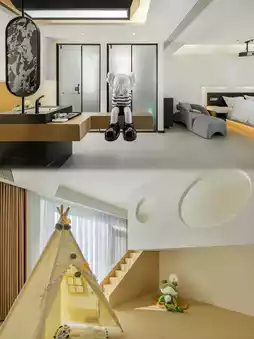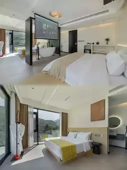 I like the Pisces room the most, it's spacious, with a minimalist black and white style, and a KAWS doll at the door. The whole house is smart-controlled, with a high-definition projector 🎦 for watching TV shows, a small tent 🏕️ for families, a star-viewing terrace, and floor-to-ceiling windows with great lighting. You can enjoy the mountain view from the bed. The room also has umbrellas, humidifiers, Bluetooth speakers, bathrobes, air purifiers, and other facilities.