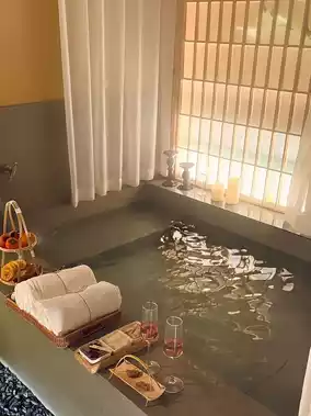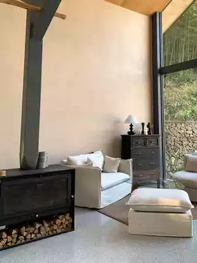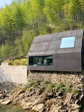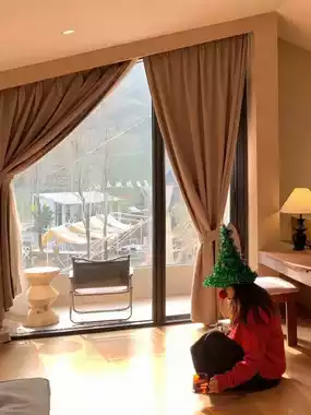 The room is amazing, with large floor-to-ceiling windows facing the bamboo forest, offering a great view! 🌳 The facilities are complete, with a projector and bathtub creating a great atmosphere. 🕯️ The morning sun shines in, making it perfect for taking Christmas photos in the room, and the triangular roof is so photogenic! 📷