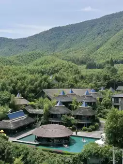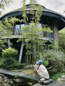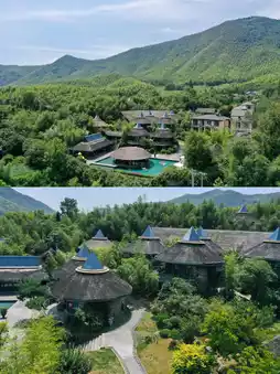 Surrounded by bamboo forests and mountains, with a Southeast Asian resort style.