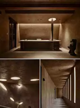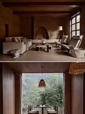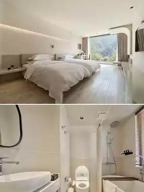 Three rammed-earth-colored buildings, "Xu," "Yi," and "Chi," stand scattered across the hillside. Using wood and stone, they outline the beauty of Eastern wabi-sabi aesthetics. Light and shadow interplay in the corridors, floor-to-ceiling windows frame the bamboo sea and cloud sea into dynamic paintings, and even the stone walls beside the bathtubs retain their original texture, telling the story of the "rebirth of an old house." Designer Zhu Xiaochen once said, "This is not architecture, but an emotional extension of nature."