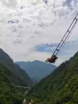 For the ascent, you can choose hiking or the cable car. Descending offers more options: hiking, cable car, zip line, or aerial drifting. We hiked up and drifted down. With breaks, playing activities, and wading in the stream, it took from 11 AM to 3 PM.