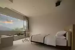 The room details are impeccable: pressure-relieving bedding, smart home system, smart toilet, and an HCK fridge stocked with minibar items—exceptional comfort.