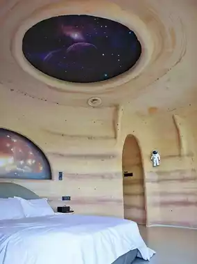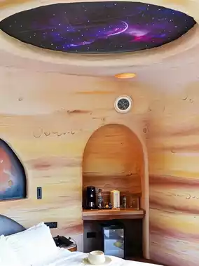✅ Surprise planet-themed rooms! Pale blue cave walls + loft slide beds 🛖 with a rotating starry ceiling—instant astronaut mode.