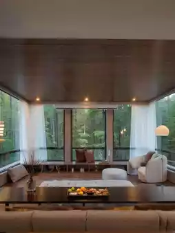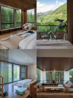 Floor-to-ceiling windows frame the bamboo forest like a painting, and the bathtub faces the mountain view. Fill it up, toss in some rose petals, and soak while gazing at the distant mist—it's so beautiful it leaves you speechless 💦. Smart toilet, central AC—no need to mention those—but they even have a big-screen projector! At night, snuggle under the blankets for a movie while listening to the rustling bamboo leaves outside, and you'll sleep like a baby 🐷.