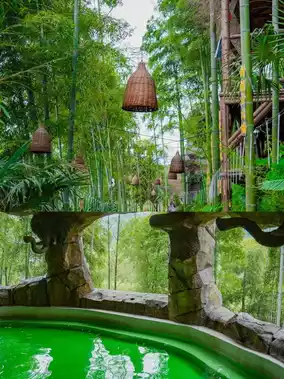 surrounded by bamboo groves, with gentle breezes rustling through the bamboo,