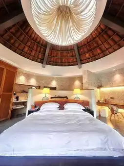 💚 The hotel is nestled in the bamboo forest of Baiyang Village, just a 3-hour 🚗 drive from Shanghai. Its design blends nature with luxury, making you feel like you're staying in the "Maldives of Bamboo Sea." I stayed in the "Xiaoqi Lanyue Pavilion," featuring a circular dome design with wooden structures and a central white draped fabric – 😎 so artistic! The large bed with pristine white linens, paired with bedside tables and warm yellow lamps, creates a cozy atmosphere. The bathroom continues the circular theme, with mosaic tiles and natural elements in every detail. Surrounded by lush greenery outside, it's the epitome of relaxation.