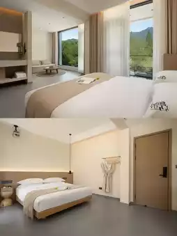 This Landscap Homestay is nestled right next to the Anji Tianmu Mountain Drift Scenic Area. Every room features floor-to-ceiling windows, offering panoramic views of lush greenery from your bed. The best part? The homestay has its own private creek with crystal-clear water, where kids can safely splash around and catch fish 🐠