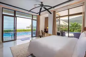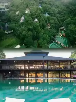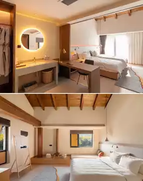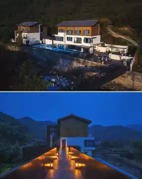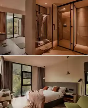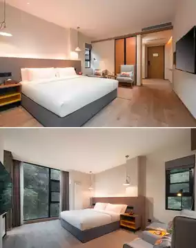 The homestay consists of three modern buildings combining natural wood and white, staggered along the mountain creek terrain. Buildings 1 and 2 are connected by a sky bridge over the creek, with cantilevered terraces blending into the bamboo creek scenery. Building 3 stands independently against the mountain, rebellious yet Zen-inspired. The lobby’s floor-to-ceiling windows face the pool and bamboo sea, with a pure white backdrop, wooden bar, and green plants, perfectly blending Nordic minimalism with mountain wilderness spirit.