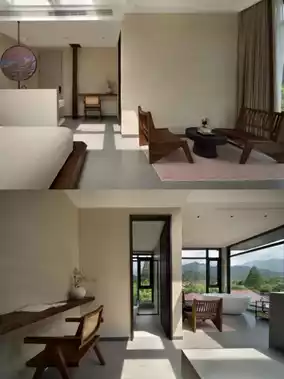 ✨ The rooms are designed in a wabi-sabi style, with floor-to-ceiling windows overlooking layers of green. Waking up to birdsong in the morning, you can often see mist drifting over the mountain peaks—truly living inside an ink painting! With underfloor heating and a bathtub by the window, soaking while watching the mountain haze drift by makes even your pores take a deep breath~