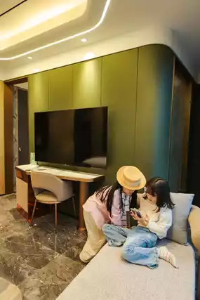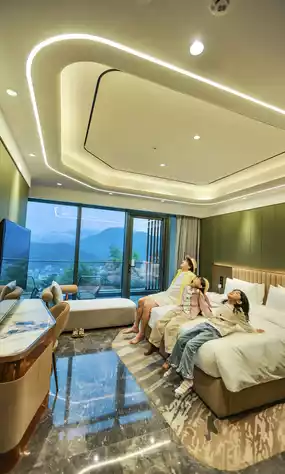 We stayed at Yunshang Grassland Resort · Banshan Yin Zhu Hotel, located at the cable car ticket gate, making it very convenient to visit Yunshang Grassland. The moment you open the door, the spacious and elegant villa-like atmosphere greets you. The room features a low-saturation green base color, exuding a sense of light luxury and exquisite detail while feeling relaxed and homey. Large floor-to-ceiling windows bring the endless bamboo sea outside fully into the room. When the morning light streams in, bamboo shadows gently sway on the textured carpet, and even the hanging linen curtains are tinged with a faint green hue. The view here is excellent, and there’s a terrace where you can watch the sunrise and sunset 🌅.