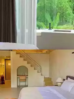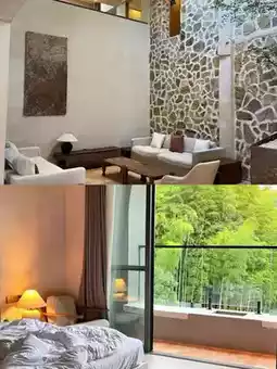 Wabi-sabi style hits the spot✨: natural wood + cement walls + huge floor-to-ceiling windows, the balcony overlooks bamboo forest and sea of clouds☁️!
