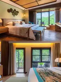 The hotel is located in a 700-acre valley, surrounded by mountains on three sides, with tea gardens, bamboo forests, and lakes. The room types include main building guest rooms as well as standalone thatched-roof villas on the tea mountain, such as the Xiaoyao Residence we stayed in. Many rooms have extra-large floor-to-ceiling windows and viewing terraces, and bathtubs in nine of the room types are placed by the window, offering beautiful mountain and water views when you open the window.