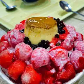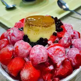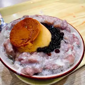 The store’s fruit ice is made with seasonal fruits, traditional pudding, condensed milk and pearls! Shaved ice at the bottom!