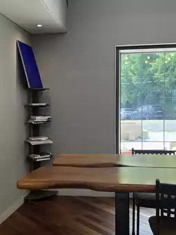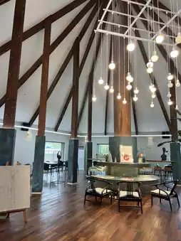 The interior has a warm wood-toned interior and large windows that let in sunlight, making it feel like you're in the middle of a real forest.