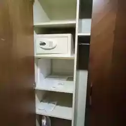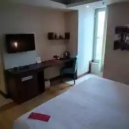 A clean room with the old town view, the facilities in the room look old, with digital safe, coffee and tea making facilities, mini bar and many more.