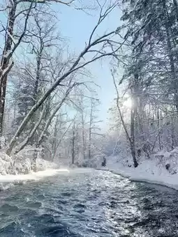 As you drift along the stream, you’ll be surrounded by frost-covered trees and snow-dusted banks. The tranquil waters reflect the pristine winter scenery, creating a stunning mirror-like effect. The crisp air and the occasional sound of ice crackling add to the peaceful atmosphere.