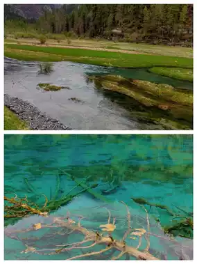 - The pool water is green and clear, with a waterfall cascading down from the cliff, misty and like a fairyland.