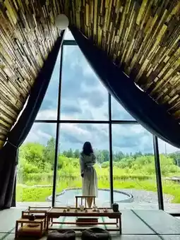 Finnish-style glass triangular villas (3m+ height) with floor-to-ceiling windows and private gardens. 87% forest coverage creates nature's oxygen bar with breathtaking views.