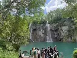 Jade-green waters with waterfalls cascading through rocks, surrounded by lush trees in summer—photos here come with a built-in filter!