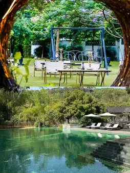 The homestay has a total of 17 villas🏡, with wooden doors engraved with "Yunmen, Fuyun, Jiushe". The butler will hang the exclusive surname plate of the guests on the door plate, giving a sense of being at home👑. Each villa starts at 300 square meters, all equipped with hot spring pools♨, with water drawn from underground metasilicate hot springs. The large floor-to-ceiling windows in the bedroom bring the garden scenery into the room, and there is a meditation cushion🧘 next to the master bedroom, making it feel like time has slowed down here~