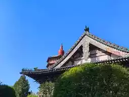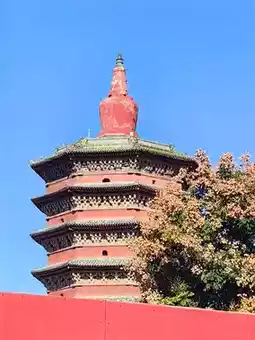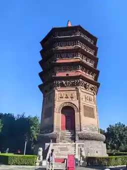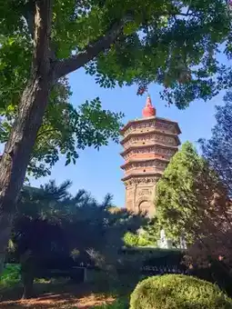 On October 2, after breakfast, I went to Tiening Temple at 8 o'clock. Following the navigation instructions, I entered the old city and followed the one-way street. There were many old houses and old buildings on both sides of the road. When I arrived at Tiening Temple, there was a parking lot next to it. Maybe it was early, there were plenty of parking spaces. After changing the ticket at the ticket office, I asked for a tour guide to explain and started the tour of Tiening Temple and Wenfeng Pagoda. Tiening Temple is very small, and it takes half an hour to finish the tour. Tiening Temple was built in the Later Zhou Dynasty and is a folk temple. After the war, only a small part of the building remains. The most eye-catching thing about Tiening Temple is Wenfeng Pagoda, which is a brick and wood structure with 5 layers and 8 corners. It is small at the bottom and large at the top, light at the top and heavy at the bottom, and the design is ingenious. The top of the tower is a Tibetan-style bowl-shaped tower, which looks like a reduced version of the White Tower in Beihai, Beijing, placed on the top of the tower. The brick carvings around it are exquisite, with iron chains and four-clawed dragons. The scenes of the Buddha's birth, practice, preaching, and nirvana are vivid. From March of this year, the tower is no longer allowed to climb, which is regrettable.