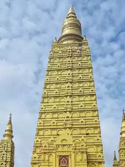 This stunning and serene temple features a magnificent golden pagoda standing tall amidst breathtaking nature.