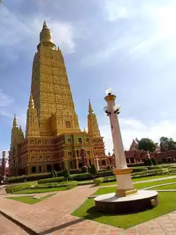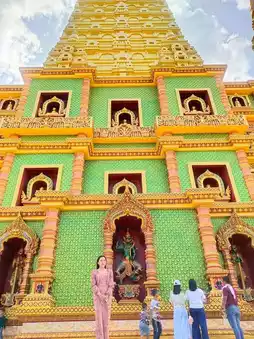 This temple stands out with its magnificent golden stupa, the Phutthatham Prakat Chedi ⛩️, which gleams brilliantly ✨ amidst the surrounding mountains ⛰️. It serves as a symbol of the flourishing Buddhist faith in southern Thailand 🇹🇭. The intricate contemporary artistry leaves visitors in awe of its beauty 👏.