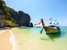 Ao Nang is located approximately 6 kilometers from Hat Noppharat Thara and 20 kilometers from the town of Krabi. A large bay with scenic beaches and 83 small islands, Ao Nang has several famous beaches which include East Rai Le, West Rai Le and Tham Phra Nang (cave) which stretches to the foot of a prominent limestone range. A boat from Ao Nang Village can be hired for sightseeing excursions around Ao Nang, Hat Tham Phra Nang and Hat Nam Mao, all of which are only accessible by foot. Other offshore isles such as Ko Poda, Ko Kai, Ko Mo and Ko Thap, are popular destinations that can be reached by a rented boat from Ao Nang. An abundance of colorful coral reefs and lovely cartoon fishes make these islands ideal for diving and snorkeling.