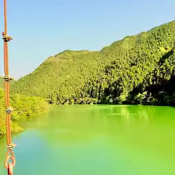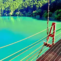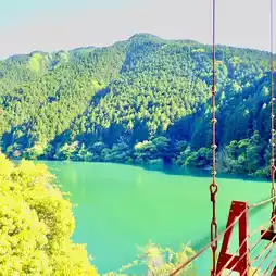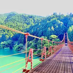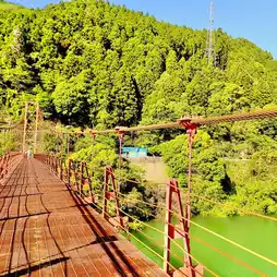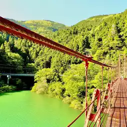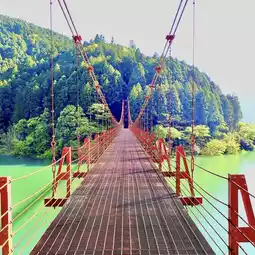 A 160m long red suspension bridge over the Futagawa Dam Lake٩(๑❛ᴗ❛๑)۶