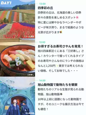 Asahikawa, which is easily accessible from Sapporo, is an attractive area with a good balance of nature and sightseeing spots✨ At Asahiyama Zoo, you will be soothed by the lively animals, and the Daisetsuzan mountain range, which shows different expressions with each season, will overwhelm you with the beauty of nature🌄