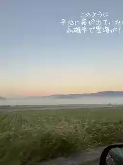 The conditions are a temperature difference between morning and evening, humidity, and rain the day before, but even if all of these conditions are met, it may not appear. The conditions on the day I went were as follows. ◾️Time when I saw the sea of clouds: around 7am⭐︎Weather: sunny⭐︎Temperature: 8 degrees⭐︎Humidity: 95%⭐︎Maximum temperature of the day: 22 degreesTemperature difference: 14 degrees◾️Heavy rain two days ago◾️I could see the morning mist from the flat ground of the hotel near Aso Station where I was staying!