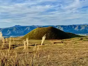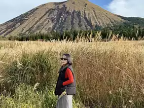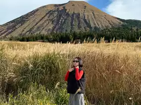 A plain near an erupting volcano. There are horses for you to ride around and enjoy the view. Since we arrived a bit late, we didn't get to ride them. Instead, we ran and took pictures with them. I really want you to visit this place. I like it so much.
