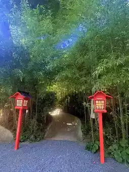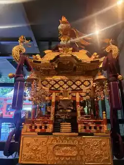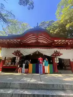 Interestingly, you'll see heart symbols on the ground here, actually called "inome." After cleaning, shrine maidens gather fallen leaves and arrange them, believed to ward off evil and bring good fortune. The community office here even has a magnificent mikoshi. Atami holds a special festival every July. After the main festival, there's a "Phoenix Chariot" (a kind of shrine) called "Hamakami-no-Mikoto" (a kind of shrine that symbolizes the removal of bad luck). Doesn't it have some similarities to some Taiwanese festivals?