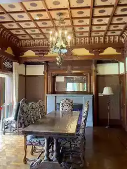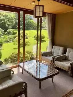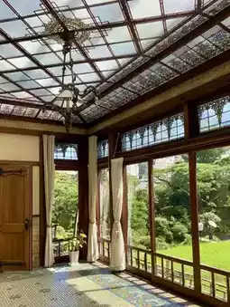 The interiors are a harmonious blend of Japanese and Western influences, with intricately designed rooms, stained glass windows, and ornate woodwork. The serene garden, with its manicured paths, koi ponds, and seasonal blooms, adds to the peaceful atmosphere—perfect for a slow, reflective stroll.
