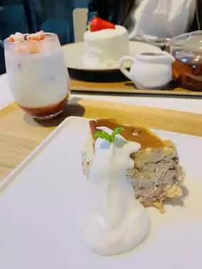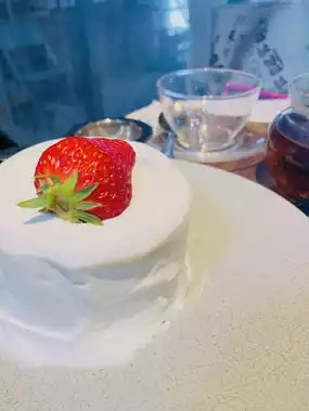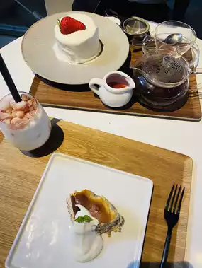 strawberry milk, seasonal hot tea, strawberry cheesecake with fresh cream,