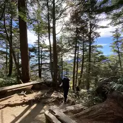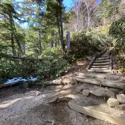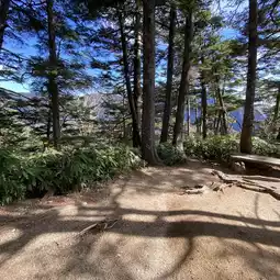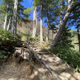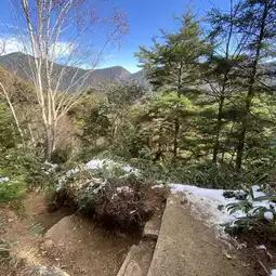 There are benches at key points on Kassen Ridge, and this is the third of them all. Little by little, the sky and the world below become visible through the trees, and you realize that you are steadily gaining altitude. Although it is only a little, you can also see traces of snowfall.