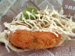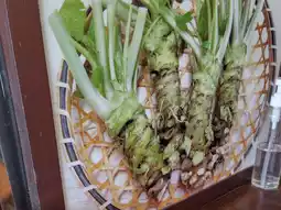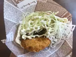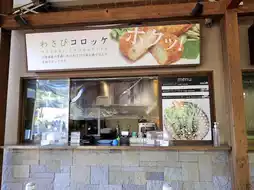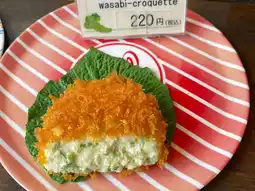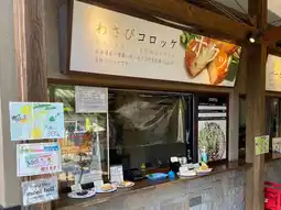 This is a restaurant located in the Daio Wasabi Farm area, Nagano Prefecture, Japan. The menu in the shop sells croquettes (mashed potatoes coated in batter and fried). But what's special about this shop is that the croquettes here are mixed with finely chopped wasabi stems and mashed potatoes. When served, they are topped with shredded cabbage and mayonnaise. It is a popular snack in this farm.