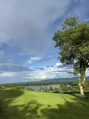 The temperature is much cooler, and the guesthouse is in the middle of the rice fields.