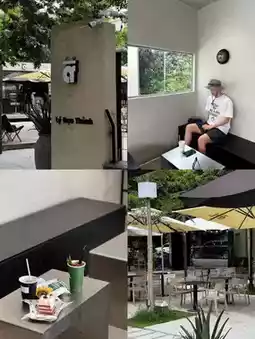The café spans two levels: the ground floor offers a cozy indoor space with a clean white palette and minimalist decor, while the upper floor opens into a tropical garden terrace—complete with leafy plants, soft lighting, and a relaxed atmosphere ideal for catching up with friends or enjoying a quiet solo break.