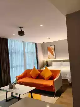 The moment you step into the room, you’re struck by the vibrant orange sofa that captures your girlish heart 🍊. The soft pillows are like clouds; once you flop onto them, all the day’s fatigue is gently soothed away. The marble-patterned coffee table is adorned with fresh little flowers—detail lovers will absolutely adore it~