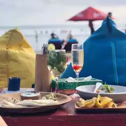 Came here to watch the enjoy the beach on the bean bags. We just happened to arrive when they open this part (4pm) so got our choice of seating. They take away the sun lounges at the front after 4pm and keep adding more bean bags to the front so not worth getting stressed about having a front row seat. Drinks only slightly pricier than normal, no extra charge for bean bag. Some drinks were a little warm when they came out. We order food but but a little pricey on the menu but its worth coz the taste is so good, I ordered fish taco, and my friend ordered other snack. All bean bags were taken around 5:45pm (Sunday). Friendly staff but always busy with lots of customers so they don't hang around you waiting for an order (suited us). Great music too!