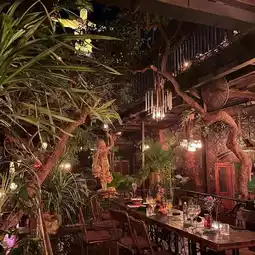 The restaurant is housed in a two-story building that resembles a dilapidated mansion with overgrown vegetation and crumbling walls. Inside, the decor is eclectic and features vintage furniture, antiques, and other objects that have been salvaged and repurposed.