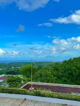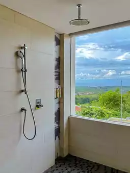 The room I stayed in was a large suite with a garden view, and the view from the bathroom was especially artistic... 👍 I could see a beautiful landscape of blue sky, green trees, and the sea in the distance💓