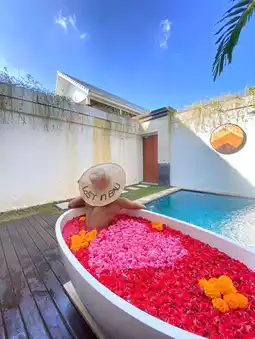 Aeera villa is a villa in the Seminyak area of Bali, this villa consists of several rooms that have a private pool and bathtub, one of which has a bathtub on the terrace which is really right in the swimming pool.