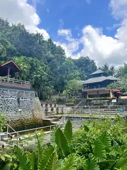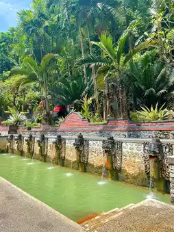 The complex is set in a beautiful tropical garden and consists of three pools. The two main pools are decorated with stone-carved Naga sculptures spewing water in the pools. These Naga’s are in Hindu mythology often associated with water and wells and are considered to be protectors of hidden treasures.
