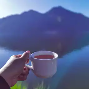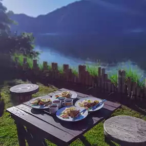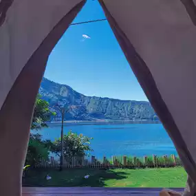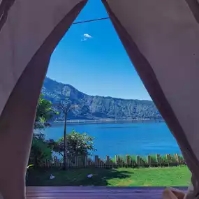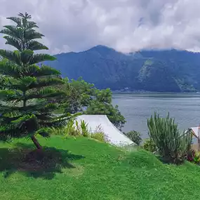 Glamping under the mountain by the lake (lake). I've been planning to go glamping for a long time. Reziki can glamp near Bali. His tent is directly facing the lake. In front of Mount Batur, Mount Abang, Mount Agung. He has that view to this day and can't move on anymore.