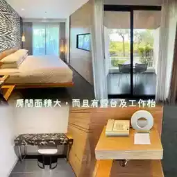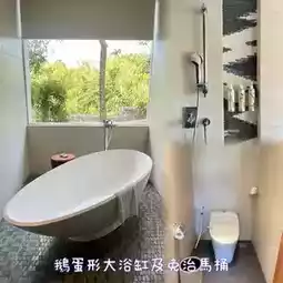 The room is fully equipped with comfortable bedding, a work table and usb charging slot, and a terrace with a view of the lush green mountains. The goose egg-shaped bathtub in the bathroom is not only comfortable, but also great for taking pictures!