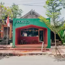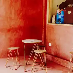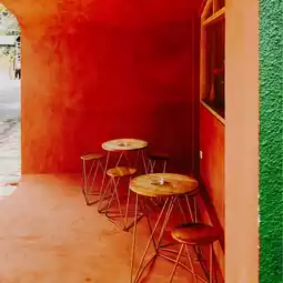 Interesting little Coffee Shop. Located on the side of the road, this coffee shop attracts attention because of its unique color, a combination of terracotta and dark green.