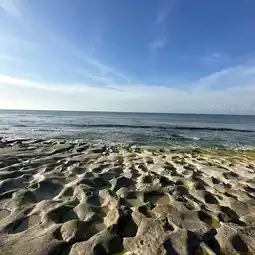 The beach is wide and sandy with coarse sand and a rocky area to enter the water.