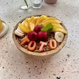 When you order, they will ask you for your name, and then they will bring you an acai bowl with your name in fruit.